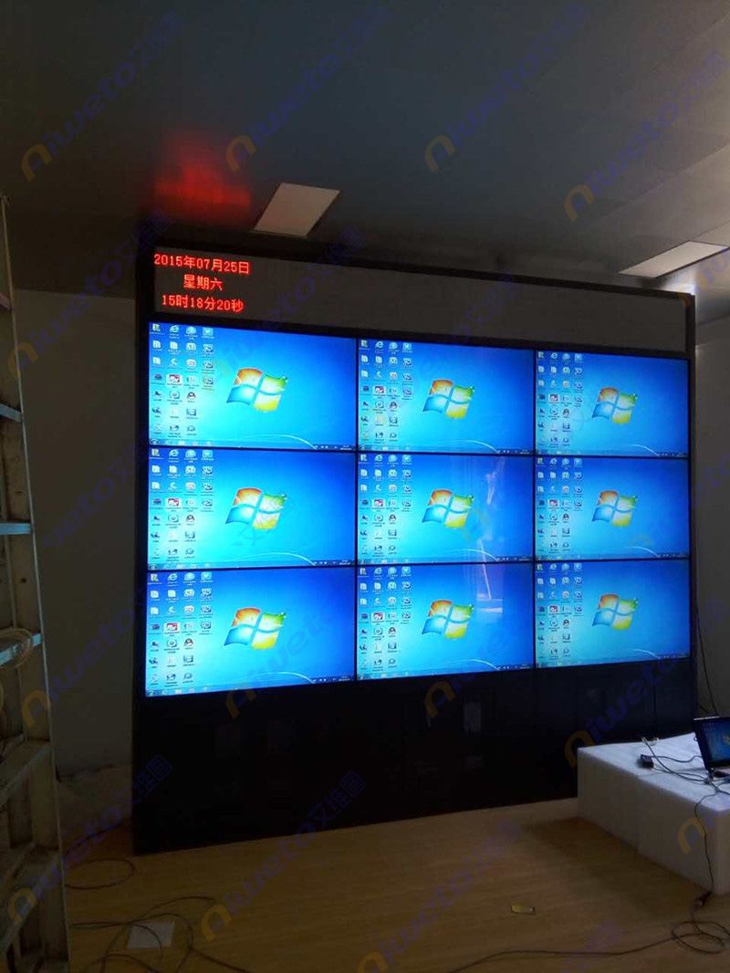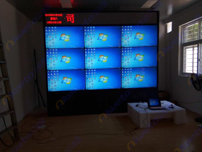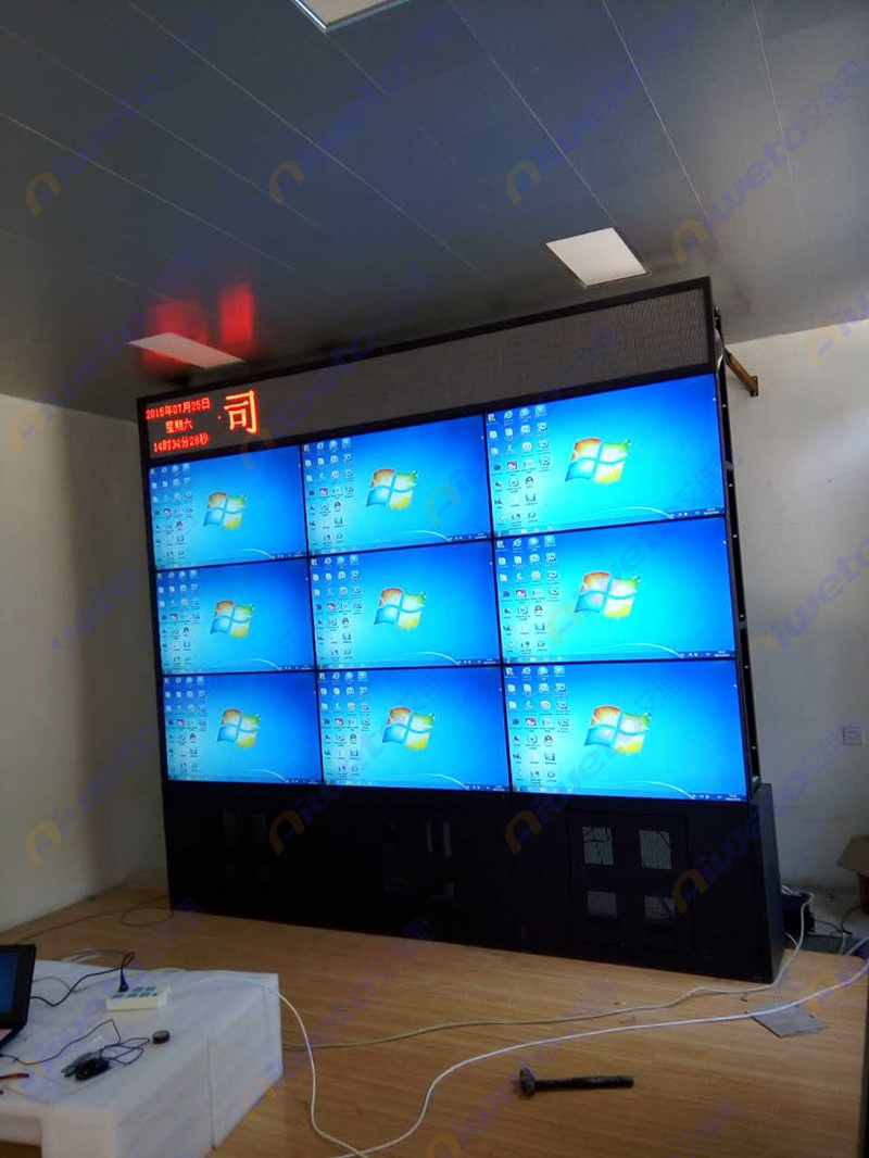 通過對客戶使用需求和部署環境的認真研究和考察,Aiweto(艾維圖)科技工程師給出了多套相關解決方案,最終選用了由9臺(Aiweto) 46寸液晶拼接單元組成的3×3大屏幕液晶拼接墻。(Aiweto) 46寸液晶拼接單元是艾維圖科技推出的一款超窄邊液晶拼接顯示器,采用工業級面板,采用先進的集成處理芯片,性能穩定,運動圖像補償等獨有的先進技術,有效的保證了輸出圖像的效果,支持7×24小時開機,拼接邊縫小,適合大屏液晶拼接項目應用。
