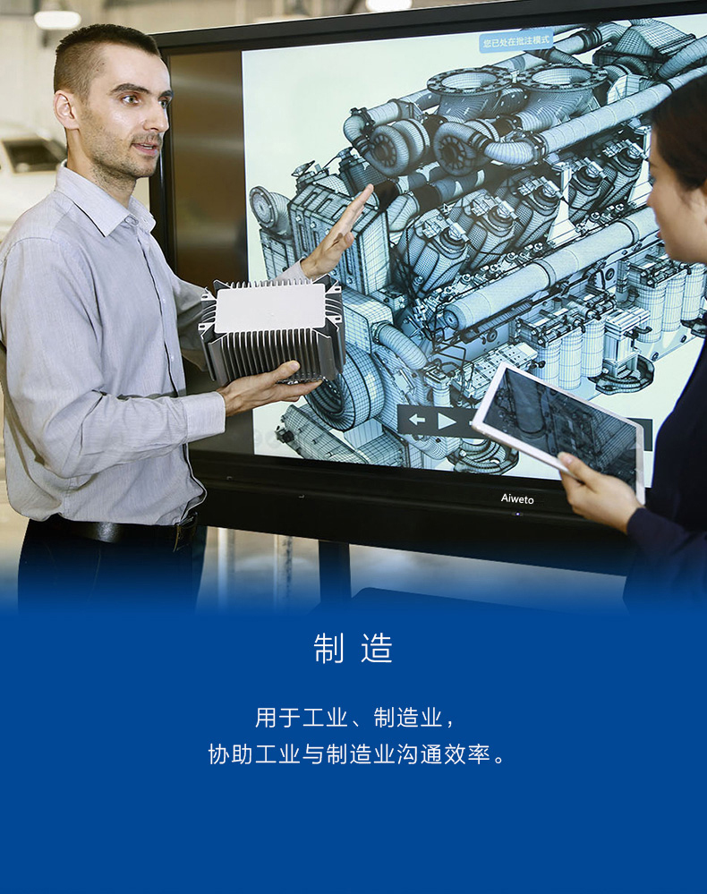 Aiweto(艾維圖)會議多媒體觸摸一體機采用LG商用IPS硬屏,全高(1920*1080)顯示,具有178度視角,高對比度和亮度,3D數字降噪,智能消除殘影、重影等失真現象,使得顯示畫面更清晰,穩定,色彩更鮮艷